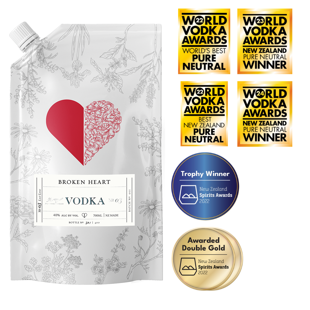 Dedicated to reducing our carbon footprint, Broken Heart Spirits has introduced New Zealand’s FIRST Eco-Refill pouches. These pouches use less energy to create, transport and reuse, spearheading our goal of becoming industry leaders in sustainability.